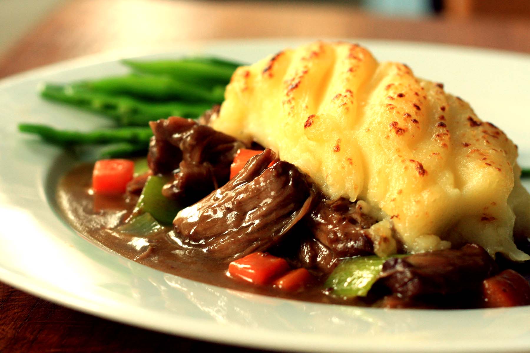 Place the meat sauce into an 8″X 3″/ 20cm X 7cm deep ceramic or glass ovenproof dish and cover with the mashed potato. Sprinkle the grated cheese on top of the potato and bake in the heated oven for 30 – 35 mins until the surface is crisp and browned. Serve immediately. Serves 6